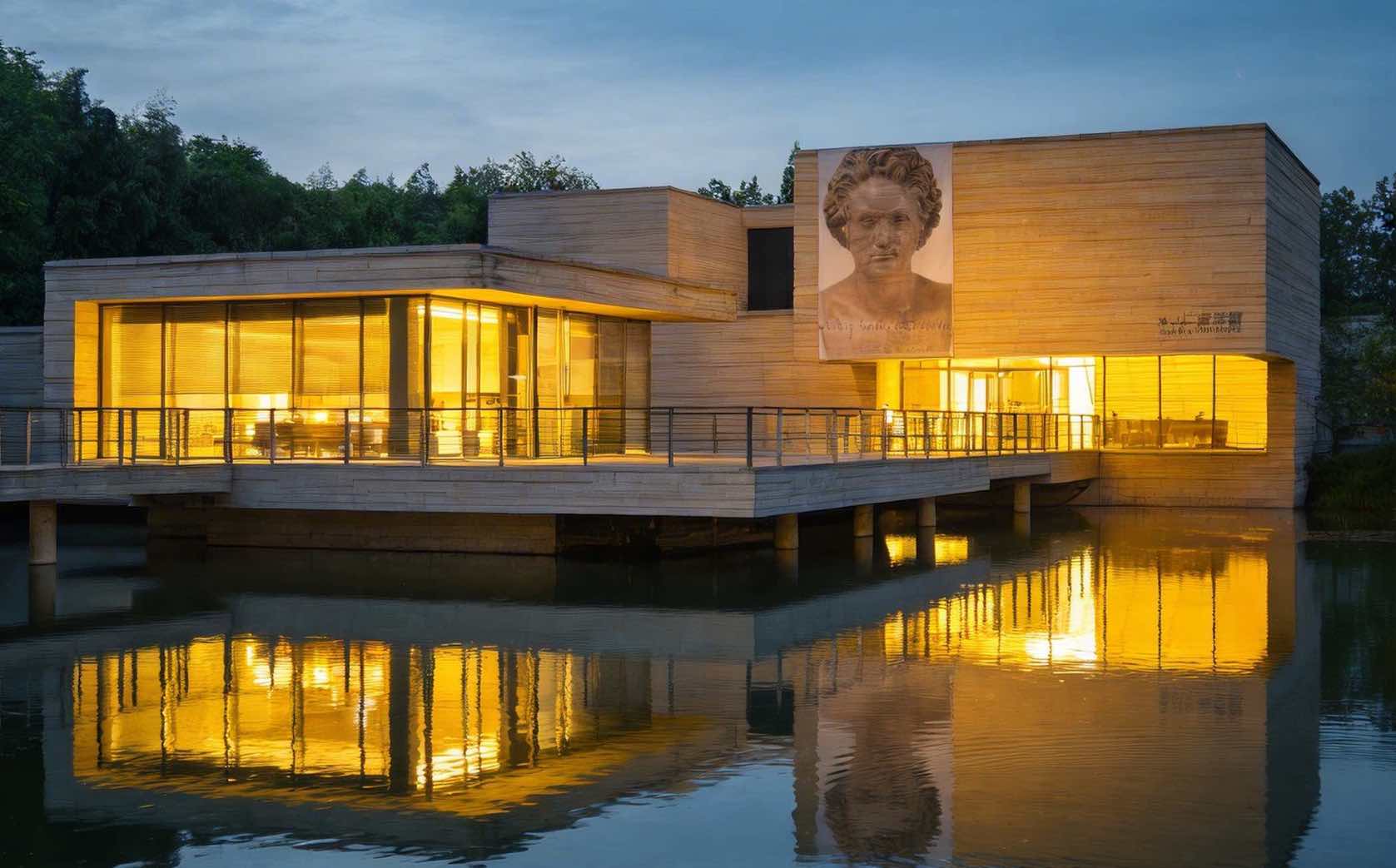 木心美术馆坐落于木心的故乡乌镇,由林兵与冈本博共同设计,被誉为“中国最文艺的美术馆”。全馆建筑坐北朝南,以修长的、高度现代的极简造型跨越元宝湖水面,成为乌镇西栅一道宁静而清俊的风景线。林兵通过混凝土体块错落形成的“山石”意象、水面倒影创造的虚静空间,以及参观流线中精心安排的停顿与框景,让整个建筑散发出一种宋画般内敛、含蓄而富有文学性的意境。建筑内部空间序列复杂而精巧,旨在隐喻木心曲折的人生与丰富的艺术世界。
